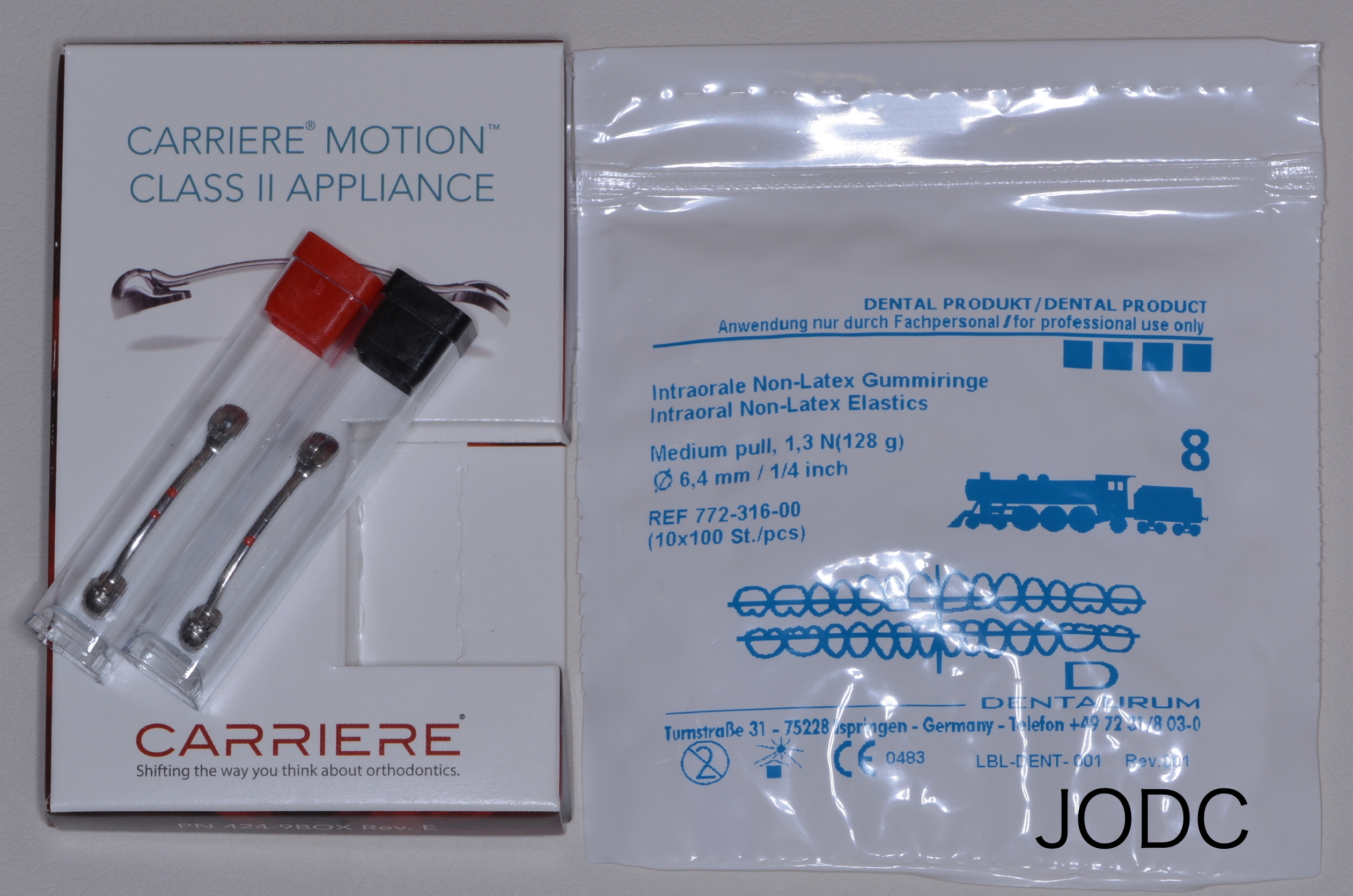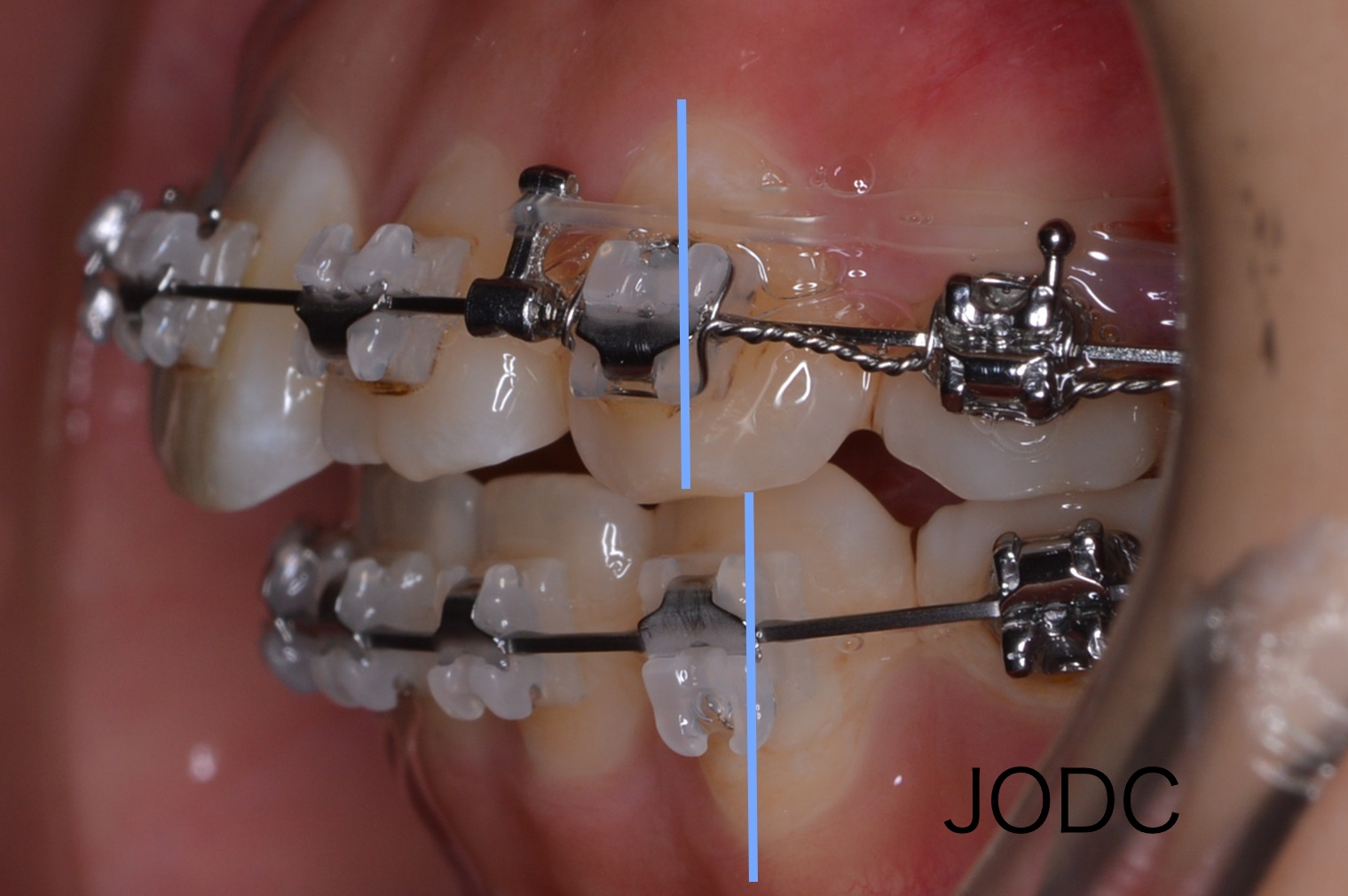 “カリエール”を口腔内に装着し、下顎左右第一大臼歯の装置とカリエールに顎間ゴムをかけます。