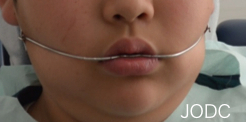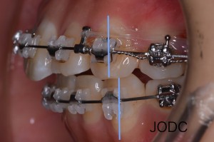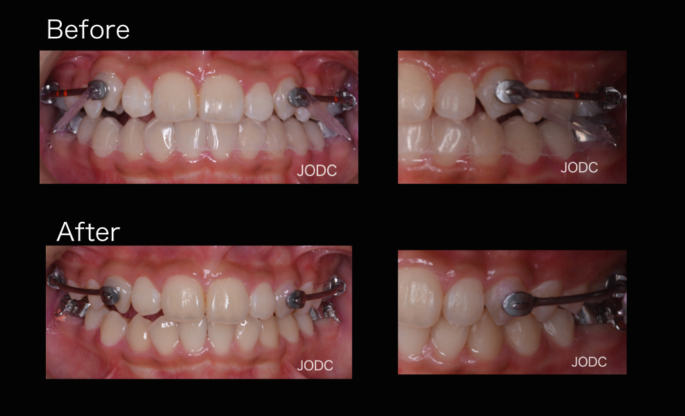 顎間ゴムをかけることで上顎は後方へ、下顎は前方へ誘導される力がかかります。この作用で上下顎の顎関係の改善をはかります(After写真は約1ヶ月後)。