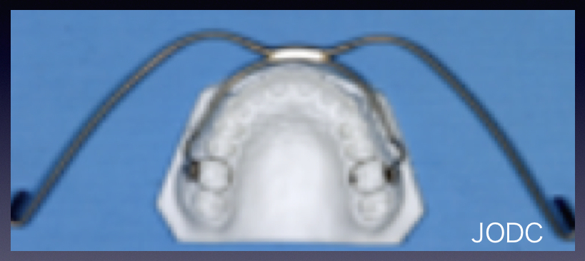 上顎前突「出っ歯」の改善を目的とする装置で、上顎左右犬歯から大臼歯を遠心移動する為に使用します。