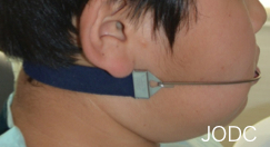 上顎の成長抑制のほか、成長期の段階で上顎の奥歯を後方に動かしたり、歯列全体を後方へ移動させる治療を行う事が出来ます。歯や顎に適正な力をかけることで、顎の骨の成長コントロールや歯の移動を行います。へッドギアの装着方法は、上の奥歯(第一大臼歯)に装着した固定式の装置(バンド)に