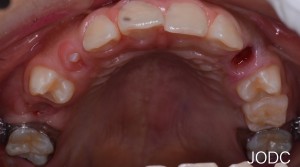 写真上が埋入時、写真下が3月後です。上顎犬歯を基準とし比較してみると全体的に遠心移動し上顎前突(出っ歯)も改善された事がよくわかります。上下顎の隙間が縮まりしっかりと咬めてますね。