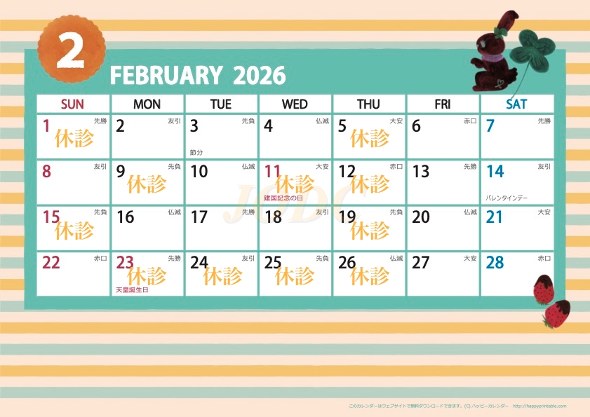 2月の休診日は木曜・祝日、第一・第三日曜日、および日曜診療後の月曜日となっております。